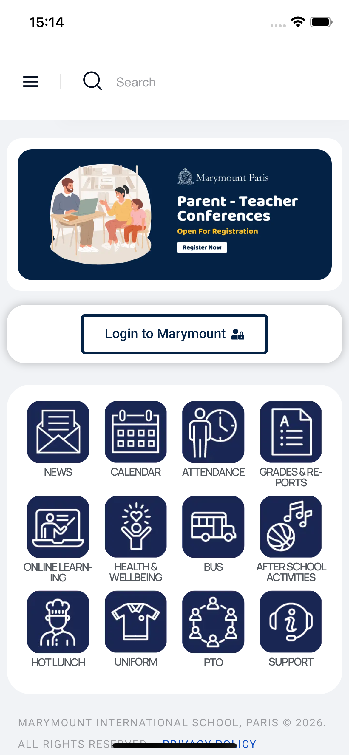The Marymount Paris App is your comprehensive digital gateway to stay connected with your child's school experience. Through this centralized platform, you can access all the essential information and services you need as a parent in one convenient location. Whether you're checking the latest school news, viewing the academic calendar, or monitoring your child's attendance and academic progress through grades and reports, everything is just a tap away.